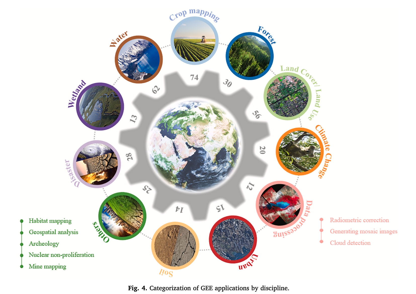 They reviewed 349 papers used GEE in a wide variety of remote sensing applications, and categorized them into 11 different groups(shown in Figure below). Different values in the gear show the number of papers in related areas. It has shown that most studies are on crop mapping, including vegetation, rice paddy, and agricultural monitoring. This is followed by studies on water, land cover/land use, and disaster. The least number of studies are on data processing.